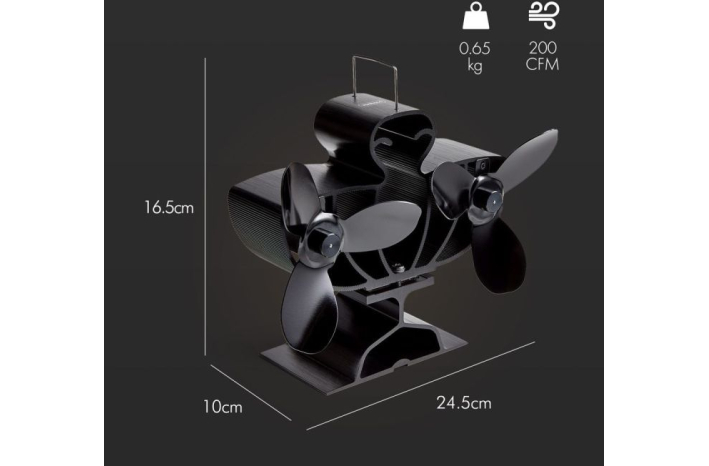 Ta učinkovit in eleganten ventilator za peč z dvojnim ventilatorjem poskrbi za enakomerno kroženje toplega zraka po prostoru, kar omogoča prijetnejšo temperaturo, hkrati pa znižuje porabo drv.