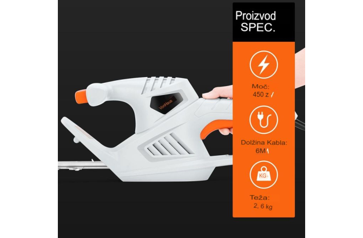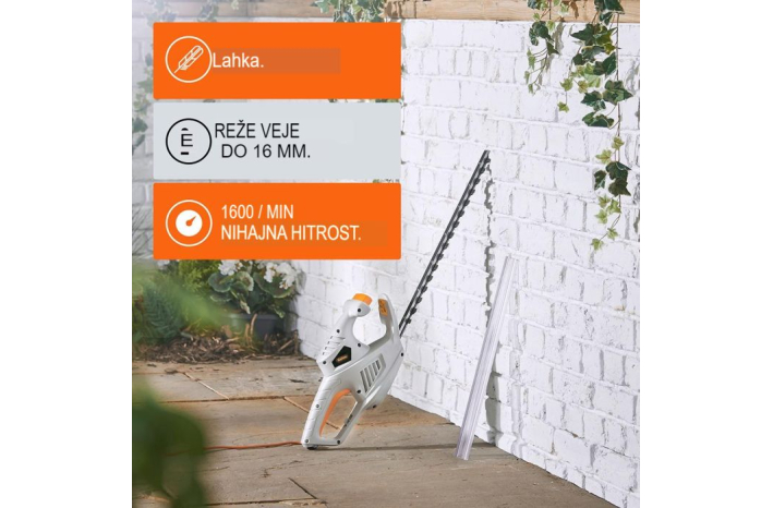 Ta obrezovalnik je idealen za obrezovanje zaraščenih živih mej, drevesnih vej ali oblikovanje grmovja, saj ga poganja močan 450 W motor, ki brez težav reže veje in vejice do debeline 16 mm.