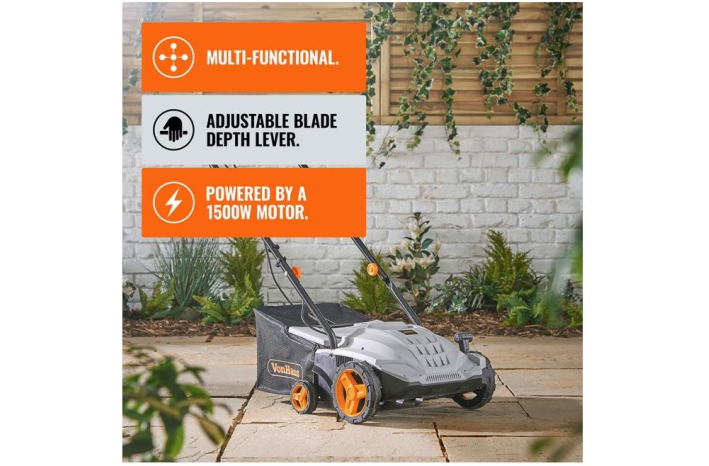 • S to napravo 2v1 je nega trate povsem enostavna. S 1500W moči preprosto odstranite mah, odmrlo travo in ostanke, da preprečite bolezni trate ali pa izboljšate drenažo tal.