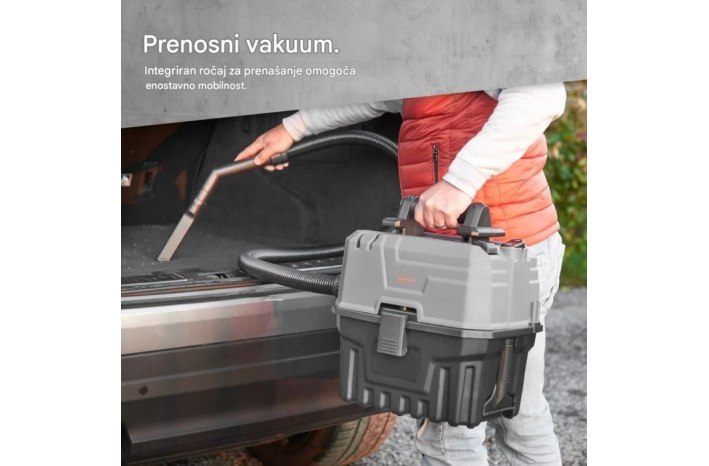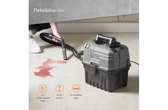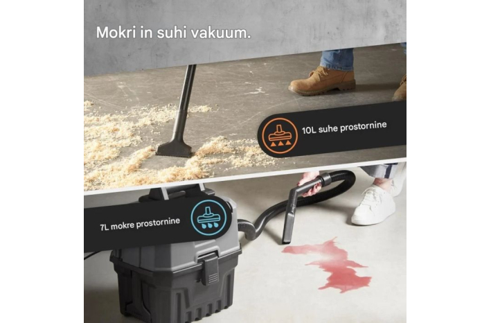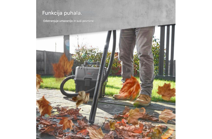 Velika posoda s prostornino 15 litrov (10 l za suho, 7 l za mokro) vam omogoča daljše sesanje brez prekinitve zaradi praznjenja. Poleg sesanja lahko s preklopom na način blower (pihanje) preprosto odstranite listje ali osušite površine.
