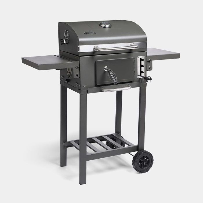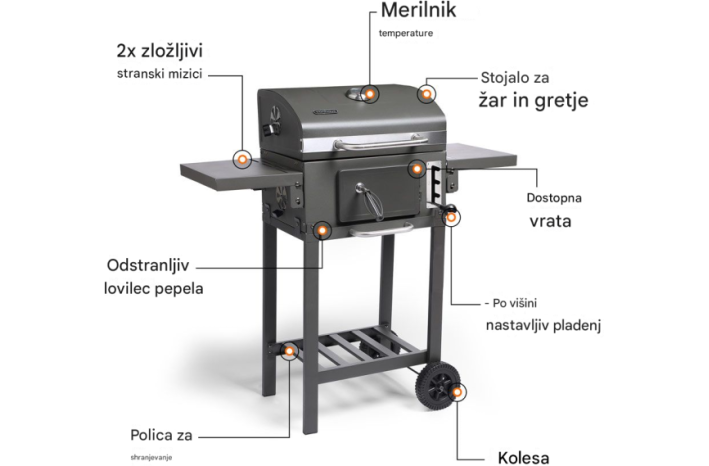 • Žar na oglje je zaradi svoje kompaktne velikosti, zložljivih polic in dveh gladkih koles preprost za premikanje in shranjevanje.