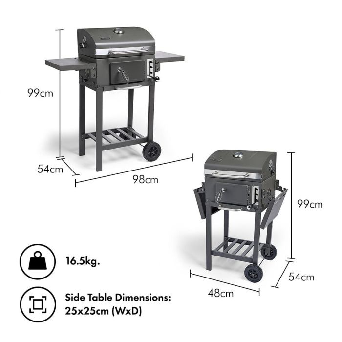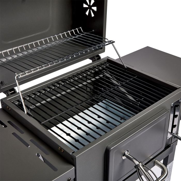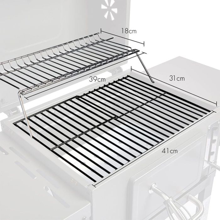 • Dve zložljivi stranski polici nudita prostor za kuhinjske pripomočke in pijačo, spodnja odlagalna polica pa omogoča shranjevanje dodatnega oglja ali lesa, da je vedno pri roki.