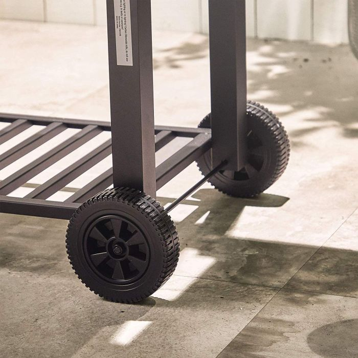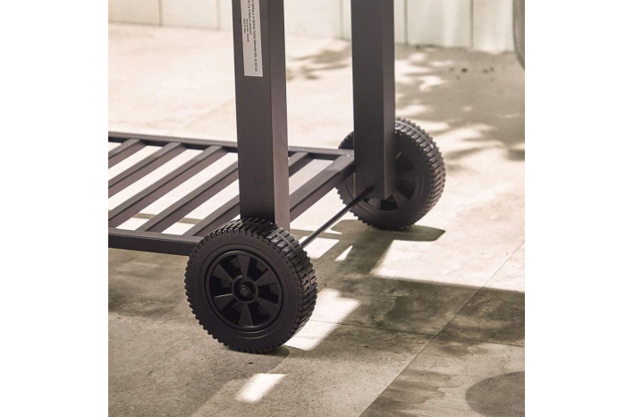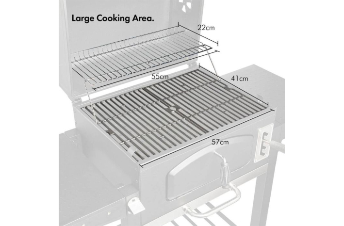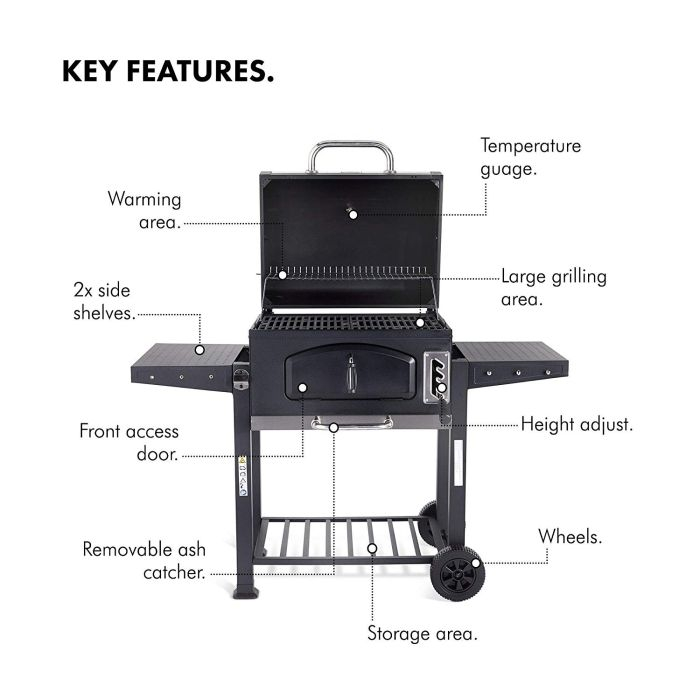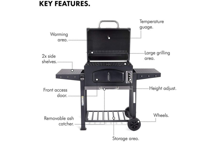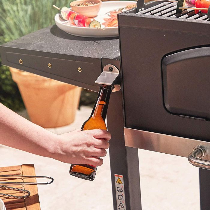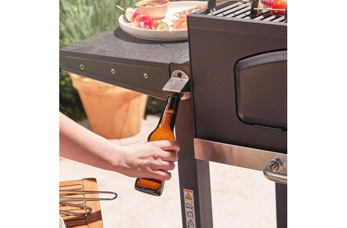 Hitro sestavljanje v manj kot 20 minutah s podrobnimi navodili pomeni, da boste v trenutku pripravljeni na peko. Žar ima dve odlagalni polici za pripomočke, šest praktičnih kavljev za orodje in nastavljivo ogljišče s štirimi stopnjami za popoln nadzor temperature. Vgrajen odpirač za steklenice doda piko na i, medtem ko dve kolesi omogočata enostavno premikanje.