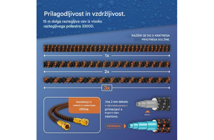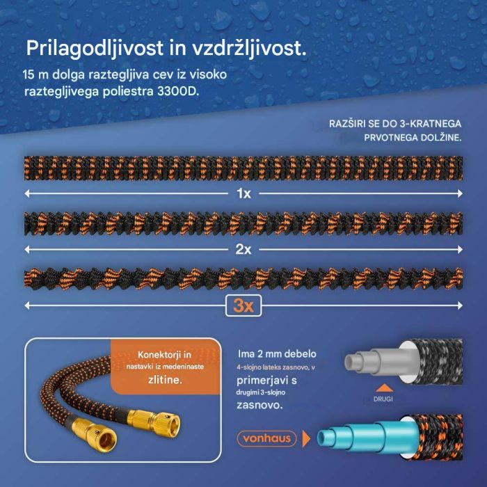 Pozabite na tradicionalne, okorne cevi – VonHaus raztegljiva vrtna cev je zasnovana za udobje in učinkovitost. Z lahkim, trpežnim dizajnom in izjemno funkcionalnostjo je idealna rešitev za vse vaše potrebe zalivanja.