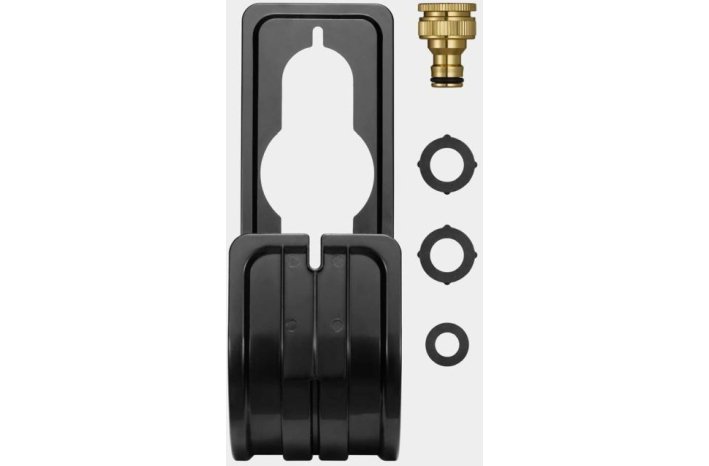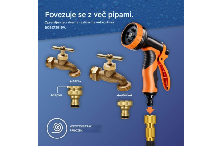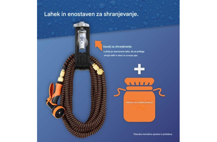 V kompletu prejmete vse, kar potrebujete za enostavno delo na vrtu: 3/4” priključek za pipo, 1/2” adapter za univerzalno uporabo, rezervne tesnilke in lepilni trak za popravila, vrečo za shranjevanje brez navlake ter kavelj za pritrditev. Kavelj lahko preprosto obesite na zunanjo pipo ali ga pritrdite na steno (vijaki za montažo na steno niso priloženi).