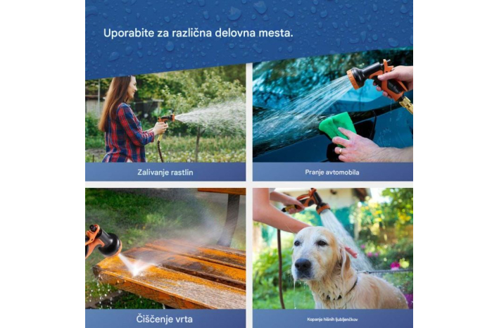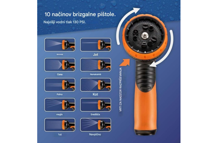 S pršilno pištolo z 10 funkcijami – kot so raven curek, močan curek, meglica in druge – boste kos vsakemu opravilu. Od pranja avtomobila do zalivanja občutljivih rastlin ali odstranjevanja trdovratne umazanije. Ergonomski nedrseč ročaj in združljivost z vodnim pritiskom do 130 PSI omogočata udobno uporabo tudi pri daljšem delu.