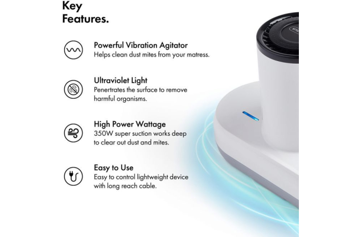 Ta UV sesalnik za ležišča, ki pomaga izboljšati higieno vašega doma, je vrhunsko orodje za čistejši in varnejši dom. Z UV-svetlobo, ki prodira v površine in odstrani škodljive organizme, ter močnim vibracijskim mešalnikom za čiščenje pršic, ki živijo v vaši vzmetnici, ta sesalnik zagotavlja pravilno, globoko čiščenje.