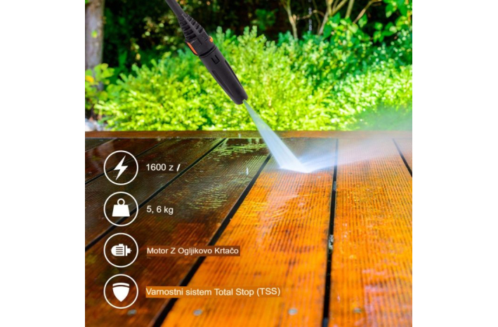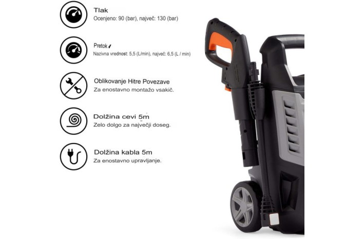 • Nastavljiv tlak med 90 in 130 bar ter pretok vode med 5 in 6,5 l/min omogočata čiščenje teras, avtomobilov in še več.