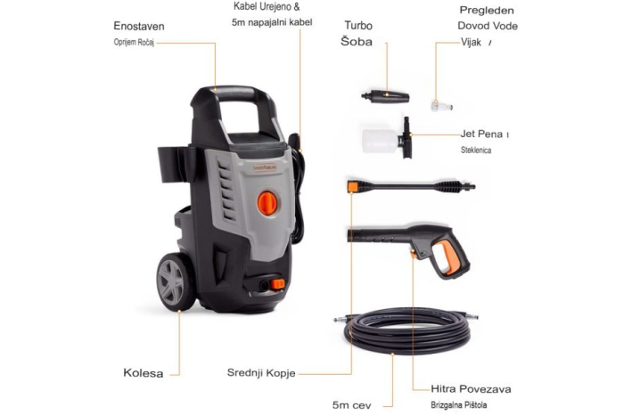 Vključuje prilagodljivo razpršilno šobo, čistilni zatič, posodo za detergent, cev, visokotlačno šobo, priključek za dovod vode, podaljšek in kljuke za shranjevanje.
