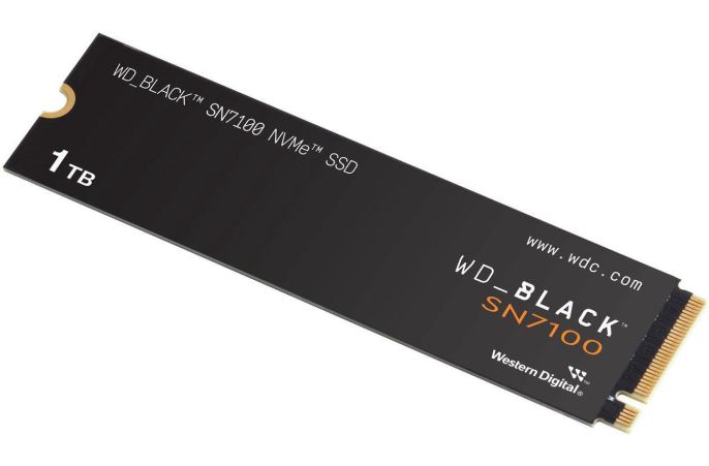 WD Black SN7100 (model WDS100T4X0E) je NVMe SSD formata M.2 2280, zasnovan za igralce in ustvarjalce vsebin. Omogoča sekvenčne hitrosti branja do 7 250 MB/s in pisanja do 6 900 MB/s preko PCIe Gen4×4 vmesnika. Naključne IOPS zmogljivosti so do 1 000 000 (branje) in 1 400 000 (pisanje). Opremljen je z naslednjo generacijo TLC 3D NAND in DRAM-less arhitekturo za večjo energetsko učinkovitost. Trpežnost je ocenjena na 600 TBW, MTTF znaša 1,75 milijona ur, SSD pa je združljiv z Gen3 sistemi.