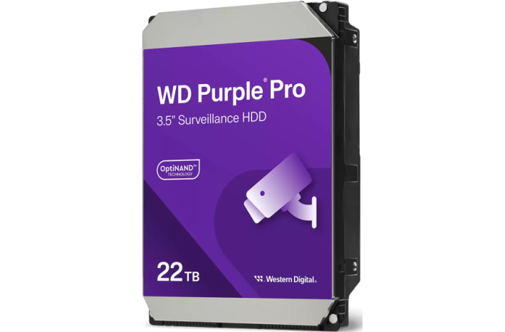 WD WD221PURP iz serije Purple Pro je namenjen najzahtevnejšim video nadzornim sistemom in AI analitiki. Disk ponuja 22 TB kapacitete, SATA 6 Gb/s, 7200 RPM in 512 MB predpomnilnika. Namenjen je neprekinjenemu 24/7 delovanju z delovno obremenitvijo do 550 TB/leto. Tehnologija AllFrame AI zmanjša izgube sličic, podprti sta do 64 HD kamer in 32 AI tokov, optično varčuje z energijo in ščiti podatke v večdisčnih sistemih. MTBF znaša 2,5 milijona ur.