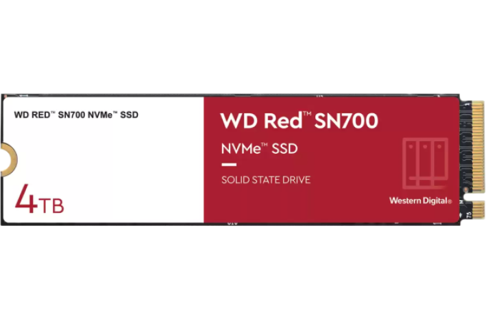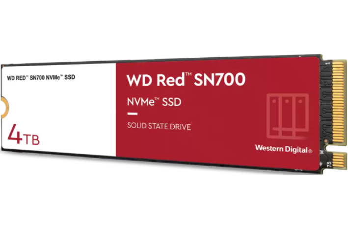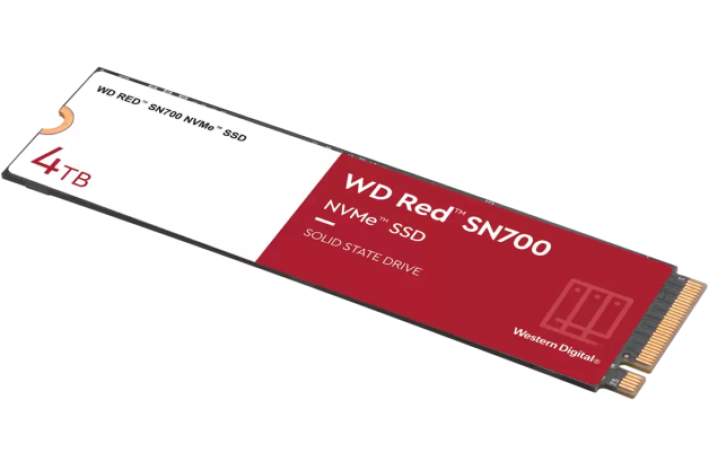 WD Red SN700 (WDS400T1R0C) je velik 4 TB NVMe SSD, optimiziran za neprekinjeno delovanje v NAS sistemih. Z vmesnikom PCIe Gen3×4 doseže sekvenčne hitrosti do 3 430 MB/s branja in do 3 100 MB/s pisanja. Uporablja 96‑slojno 3D TLC NAND (Toshiba BiCS4), vgrajen ima DRAM-podprt WD Triton MP28 kontroler, ter nudi naključne hitrosti do 550 000 IOPS pri branju in 520 000 IOPS pri pisanju. Izdelan je za 24/7 rabo z visokim TBW in zanesljivostjo.