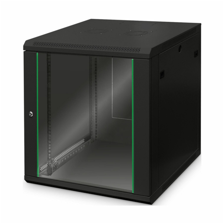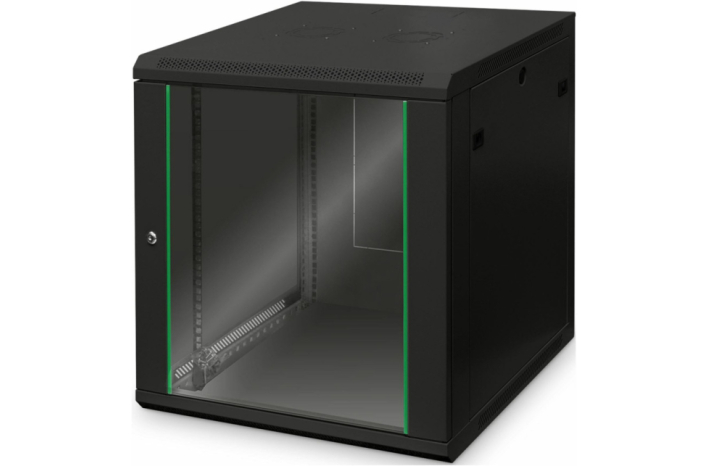 Digitus komunikacijska omara 12U za zidno montažo s snemljivima stranicama, Model Dynamic Basic, Eleganta oblika, Lahka, Ključavnica, črne barve, dimenzija: višina 12U 638 mm, širina 600 mm in globina 600 mm...