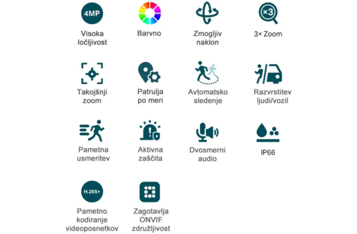 Pametne funkcije: Klasifikacija ljudi in vozil, zaznavanje vdorov v območje, zaznavanje prečkanja črte, zaznavanje ljudi, zaznavanje vozil, zaznavanje vstopa v regijo, zaznavanje izhoda iz regije, zaznavanje zapuščenega predmeta, zaznavanje odstranitve predmeta
