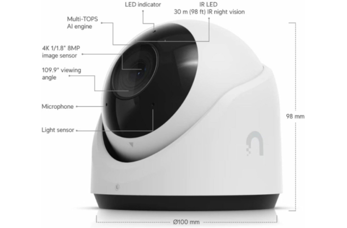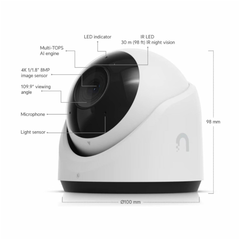 Ubiquiti UVC-G6-Turret je bela robustna 4K PoE zunanja kamera nove generacije z 8 MP senzorjem, naprednim AI zaznavanjem in obdelavo slike ter 3-osnim ročnim nastavljanjem. Ponuja izjemno kakovost slike, pametno prepoznavanje avtomobilov, ljudi in registrskih tablic. Idealna za varovanje zunanjih prostorov.